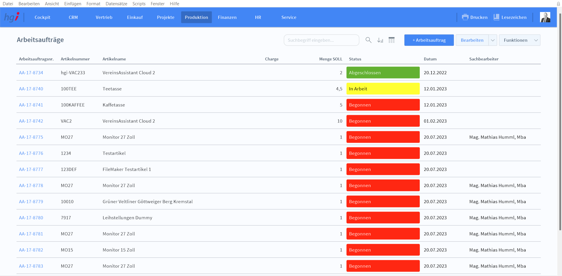 Die für die Herstellung erforderlichen Arbeitsanweisungen können ausgedruckt werden. Nach Fertigstellung und Rückmeldung des Arbeitsauftrags als abgeschlossen, werden die Stücklistenartikel vom Bestand abgezogen und die fertiggestellten Produkte dem Lagerbestand hinzugefügt.
