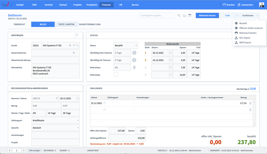 Der automatisierte Mahnprozess generiert notwendige Mahnungen und aktualisiert den entsprechenden Mahnstatus. Integrierte Schnittstellen zu den Buchhaltungssystemen BMD und RZL erleichtern die digitale Übertragung der Dokumente für die Buchführung. Zusätzlich sind Berichte und diverse Listen für Auswertungen verfügbar.