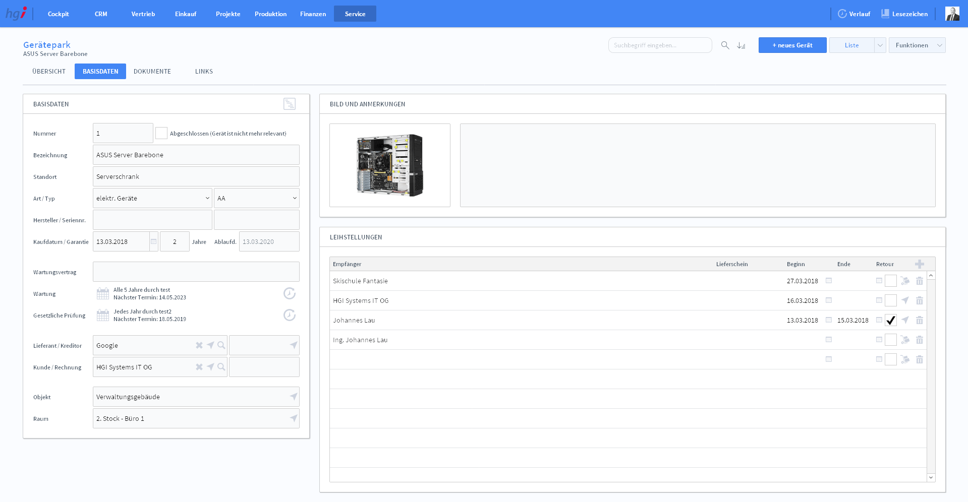 Die Module für Geräte, Objekte und Fahrzeuge dienen der Verwaltung von internen Daten oder solchen, die mit spezifischen Aufträgen in Zusammenhang stehen. Das Modul Geräte ermöglicht beispielsweise die Verwaltung von Kundengeräten, inklusive Übersicht über Garantiezeiträume, Seriennummern, Fotos und benötigte Ersatzteile.