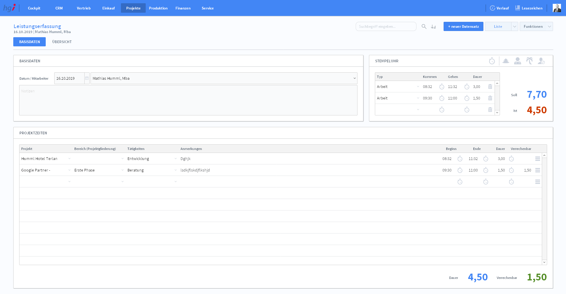 Projektteammitglieder haben die Möglichkeit, ihre Arbeitszeiten und Tätigkeiten im Modul zur Leistungserfassung den einzelnen Projekten zuzuordnen und diese Einträge mit bestimmten Punkten des Projektzeitplans zu verlinken.