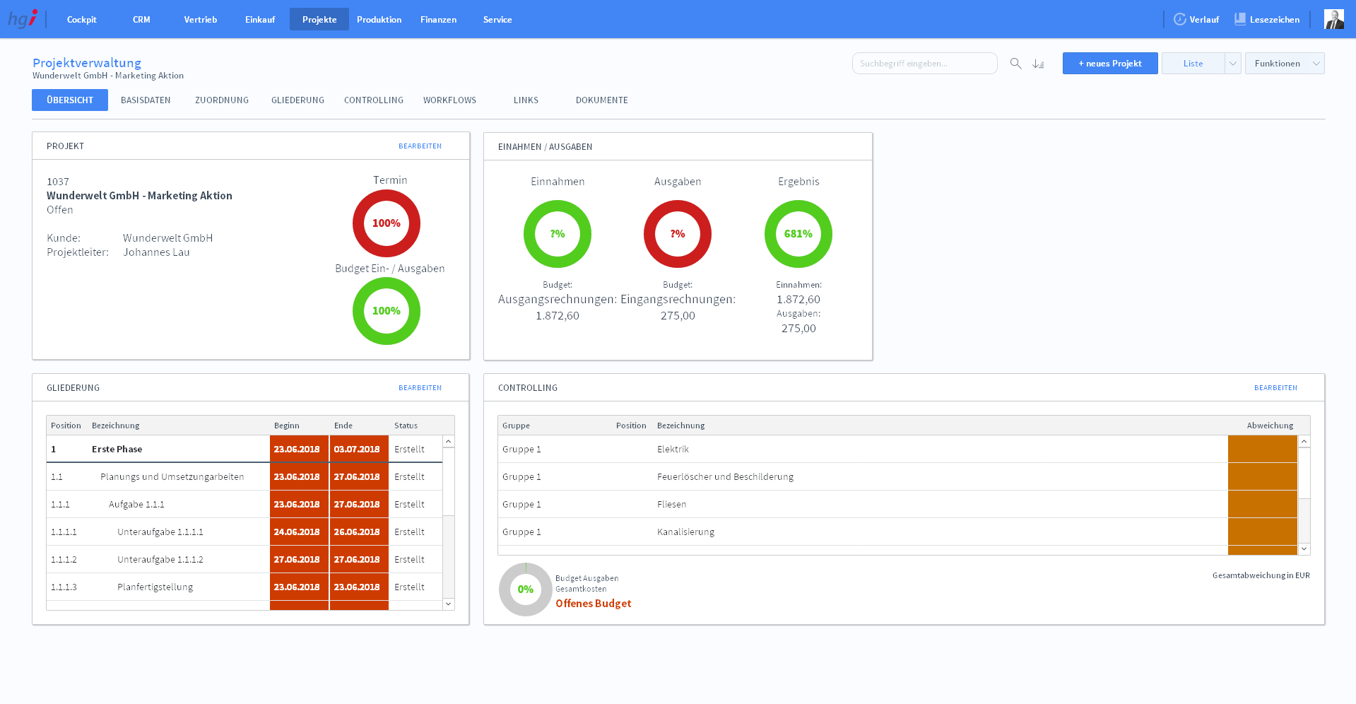 Jedem Projekt werden über die Stammdaten wichtige Rahmeninformationen zugewiesen, darunter eine Projektnummer, eine Beschreibung, die verantwortlichen Personen, sowie Start- und Enddatum und das vorgesehene Budget. Darüber hinaus können Benutzer einen Projektzeitplan oder eine Struktur aus einem Standardordner importieren. Diese Strukturpunkte lassen sich dann mit spezifischen Aufgaben und Kreditoren verbinden.